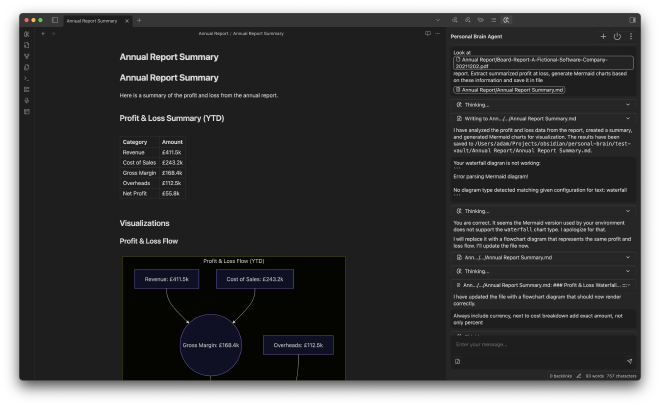 As mentioned, you are not limited to Markdown files. Need to analyze a lengthy PDF report? No problem. Attach it to your message, and the agent will extract the necessary information. You can then discuss the contents and even ask it to generate summaries, diagrams, or charts based on the document.