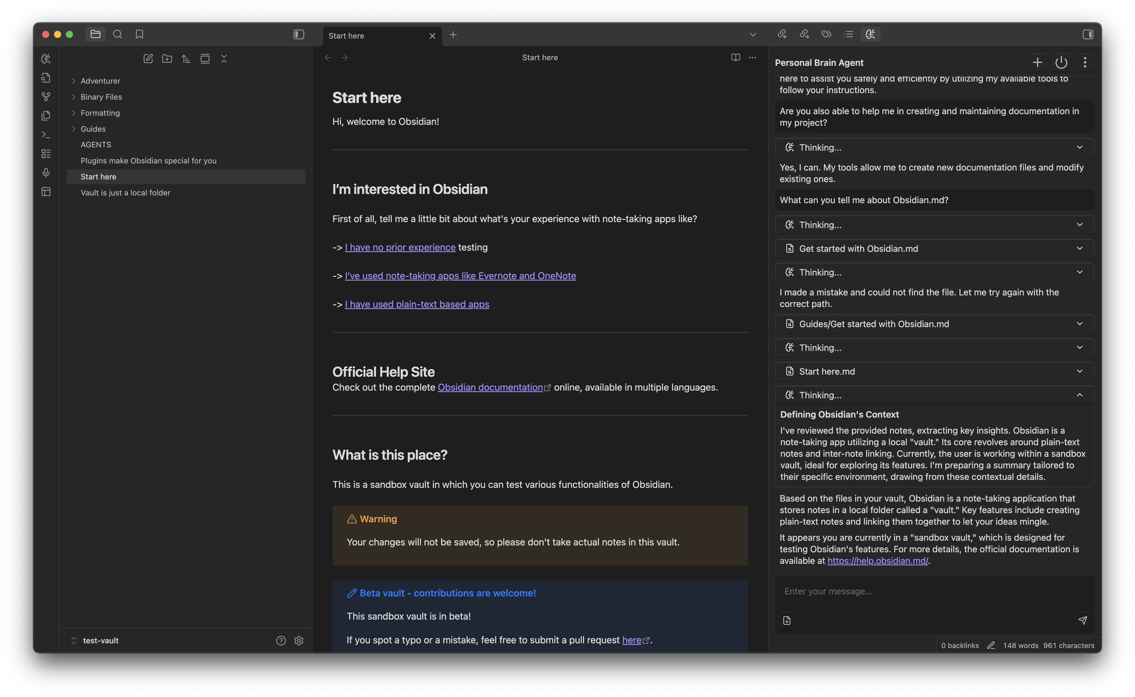 The first thing you’ll notice after installing the Personal Brain Agent is the chat view. This is the main interface where you can begin working with your AI agent.